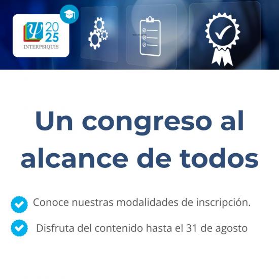 En Interpsiquis creemos que la formación en salud mental debe estar al alcance de todos. Por eso, ofrecemos distintas modalidades de inscripción que se adaptan a las necesidades y posibilidades de cada profesional. Tanto con la inscripción Básica, podrás acceder a todos los contenidos del congreso hasta el 31 de agosto de 2025, disfrutando de ponencias, simposio...