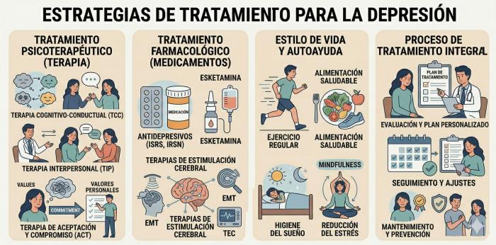 El tratamiento de la depresión es un aspecto fundamental en la atención psiquiátrica debido a la alta prevalencia, la tasa elevada de recaídas y la significativa discapacidad que genera. El objetivo principal del tratamiento es alcanzar la remisión clínica, ya que esta mejora el pronóstico a largo plazo.