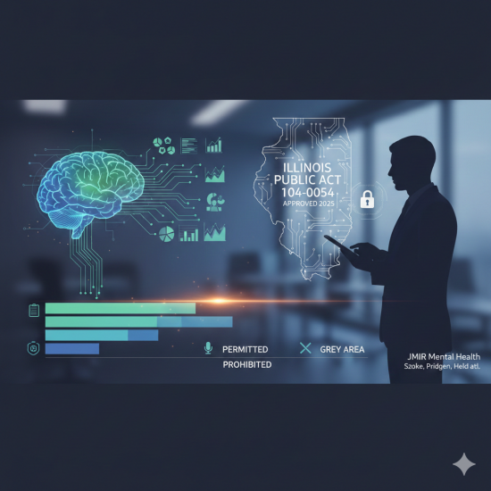 Szoke D, Pridgen S, Held P. Artificial Intelligence in Mental Health Services Under Illinois Public Act 104-0054: Legal Limits and a Framework for Establishing Safe and Effective AI Tools. JMIR Mental Health. 2025;12:e84854. doi:10.2196/84854.© 2025 Daniel Szoke, Sarah Pridgen, Philip Held. Artículo original publicado en JMIR Mental Health(https://mental.jmir.org).Este contenido se distribuye bajo la licencia Creative Commons Attribution 4.0 International (CC BY 4.0), que permite su uso, distribución y reproducción en cualquier medio, siempre que se cite adecuadamente la fuente original.