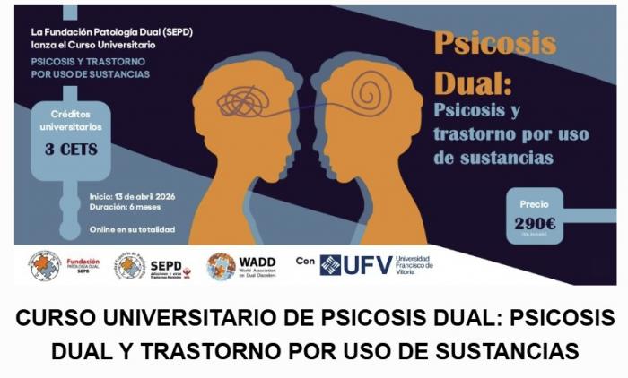 La Fundación Patología Dual de la SEPD lanza el Curso Universitario de Psicosis Dual: Psicosis Dual y Trastorno por Uso de Sustancias, que cuenta con un programa único que combina los últimos avances en investigación, diagnóstico y tratamiento personalizado.  Fechas Curso del 13 de abril de 2026 al 14 de septiembre 2026. On-line en su totalidadC...