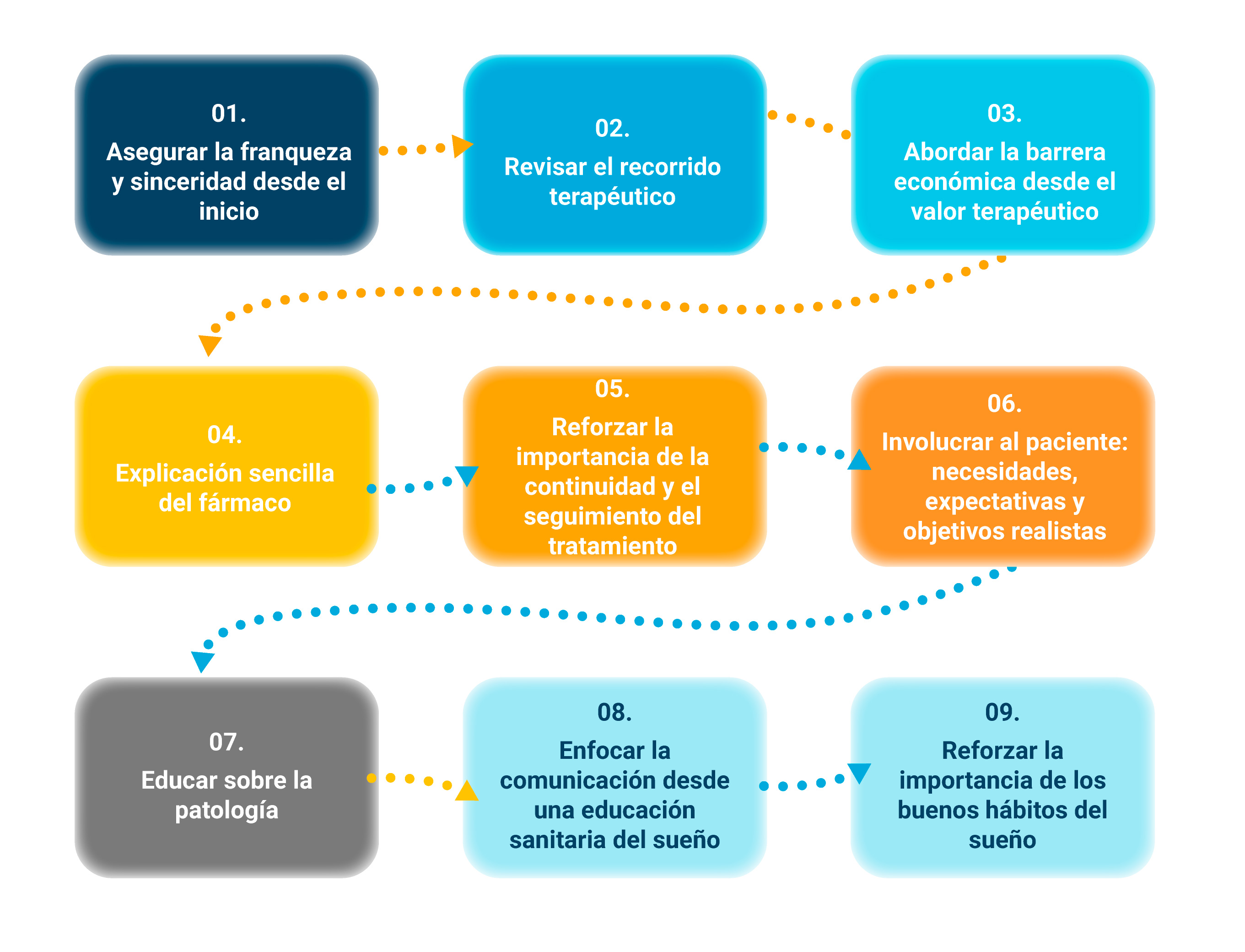 1. Franqueza y sinceridad desde el inicio: desde la primera consulta, cuando el médico determina la idoneidad del tratamiento con Quviviq®, deben abordarse aspectos como el coste del tratamiento de forma abierta, contextualizando el precio dentro del valor clínico y el mecanismo de acción diferencial.9 Es fundamental explicar que la mejoría requiere compromiso mediante el cambio de hábitos de higiene del sueño y continuidad del tratamiento durante un periodo de tiempo mínimo, estableciendo desde el inicio una relación basada en la confianza.