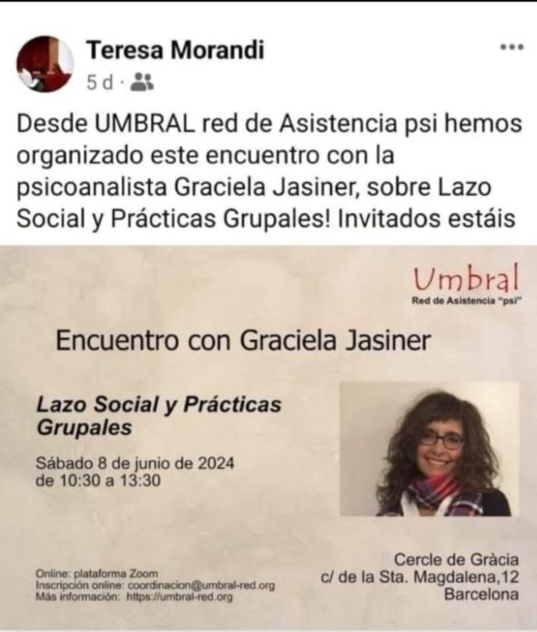 Un encuentro donde se transmitirán herramientas para pensar el lazo social hoy y los diferentes dispositivos grupales y para abordar nuestra práctica con eficacia.PRESENCIAL en Barcelona. Por zoom desde otros sitios Inscripci&o...